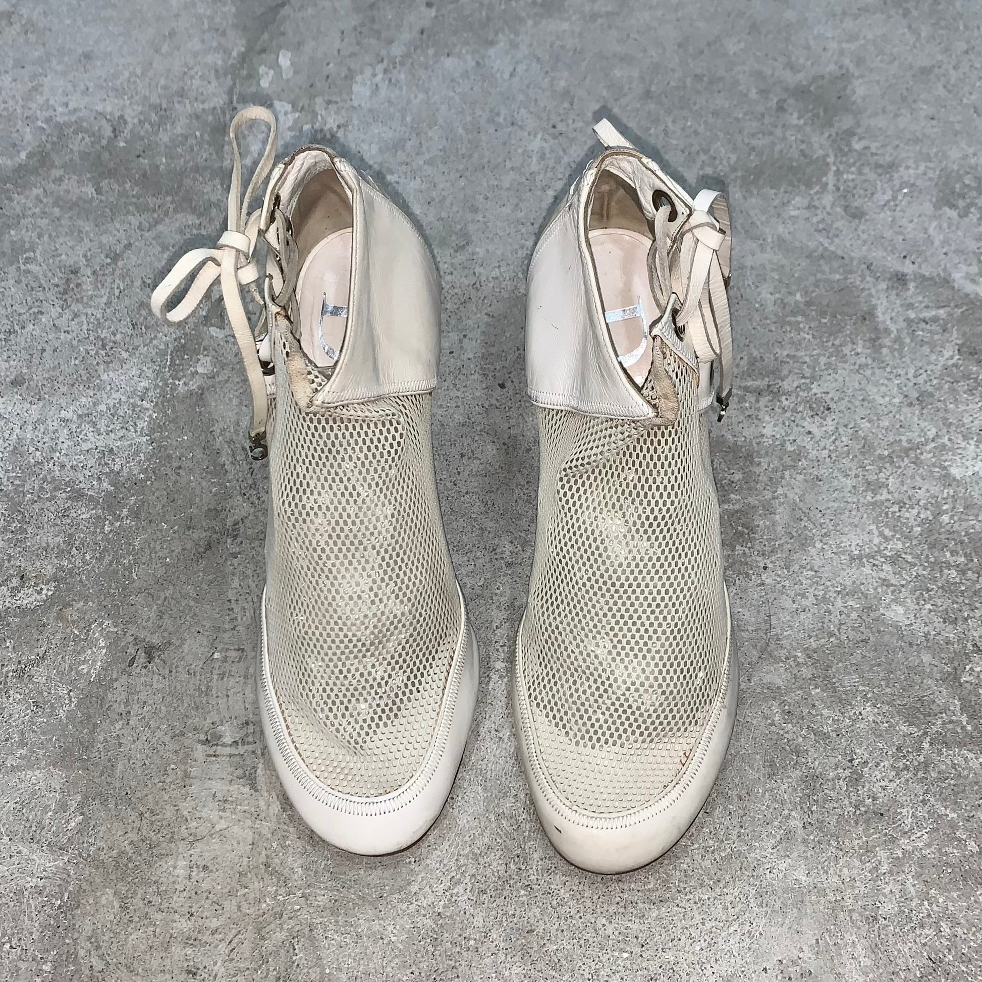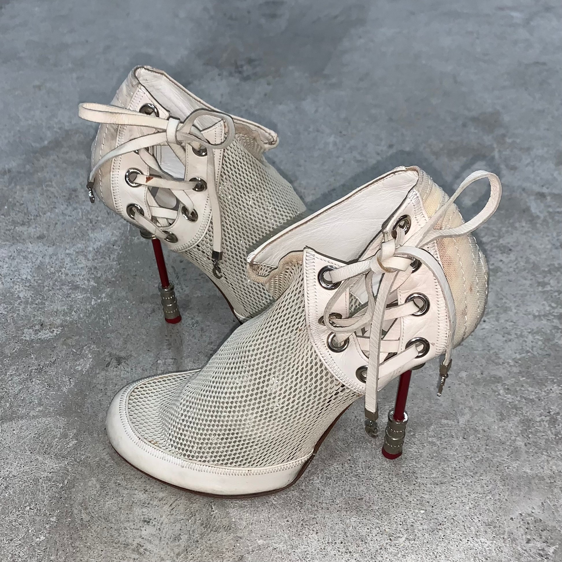 house of Dior made these white net and leather into an ankle length silhouette